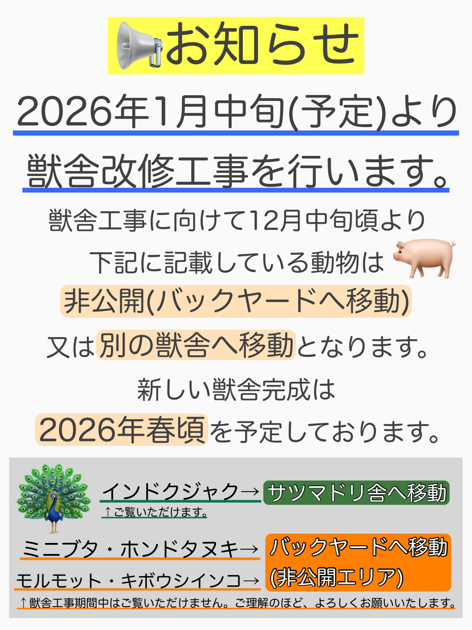 【お知らせ】なかよしらんど一部獣舎改修工事のお知らせ。