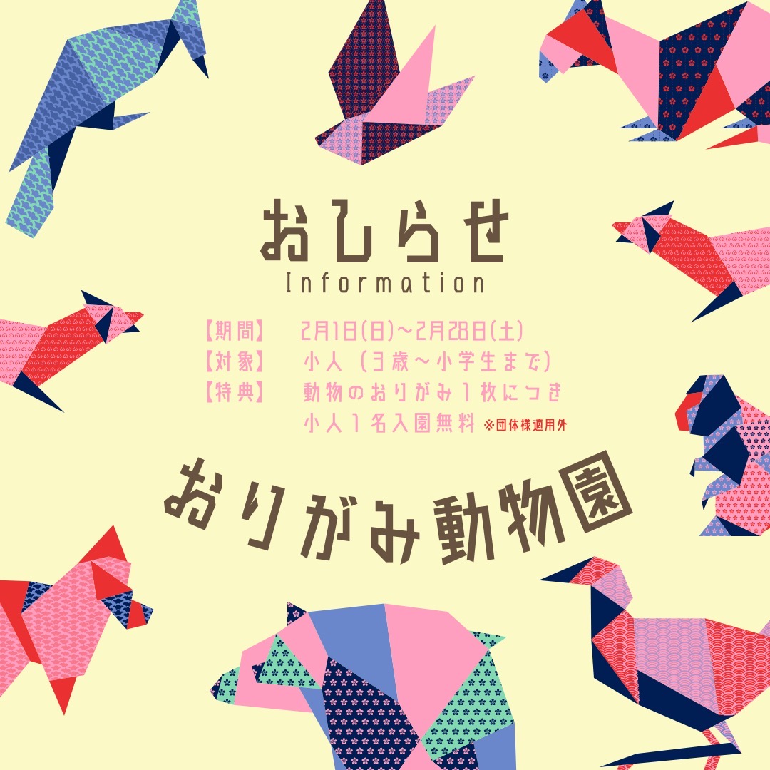 期間中、「動物型のおりがみ」を折ってご持参いただくと1枚につき小人1名が無料でご入園いただけます!