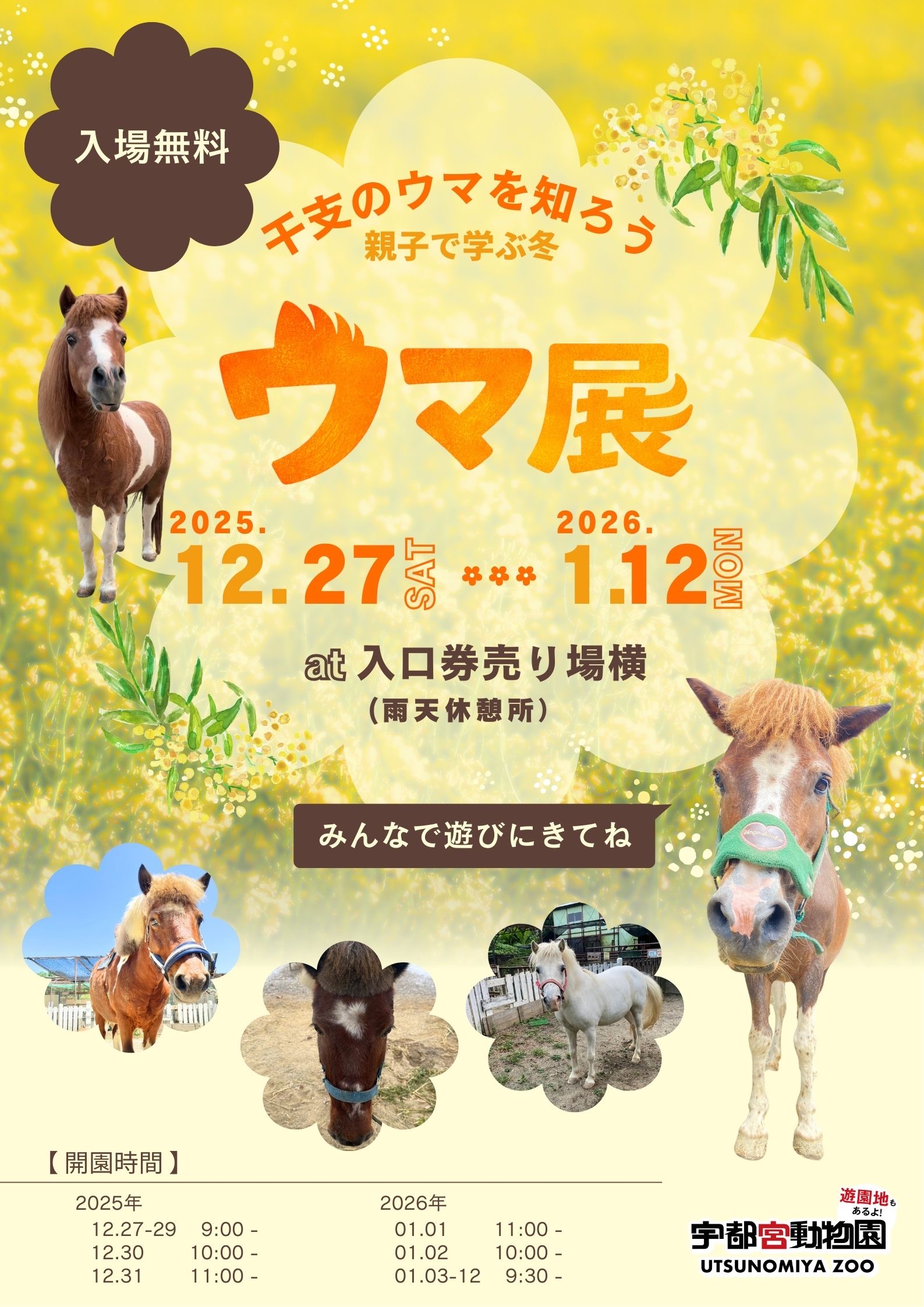 【日 程】2025年12月27日㈯~2026年1月12日㈪ 【時 間】営業時間中 【場 所】入園口となり雨天休憩所 【内 容】干支のウマをしろう! 【備 考】観覧無料(動物園入園料別)